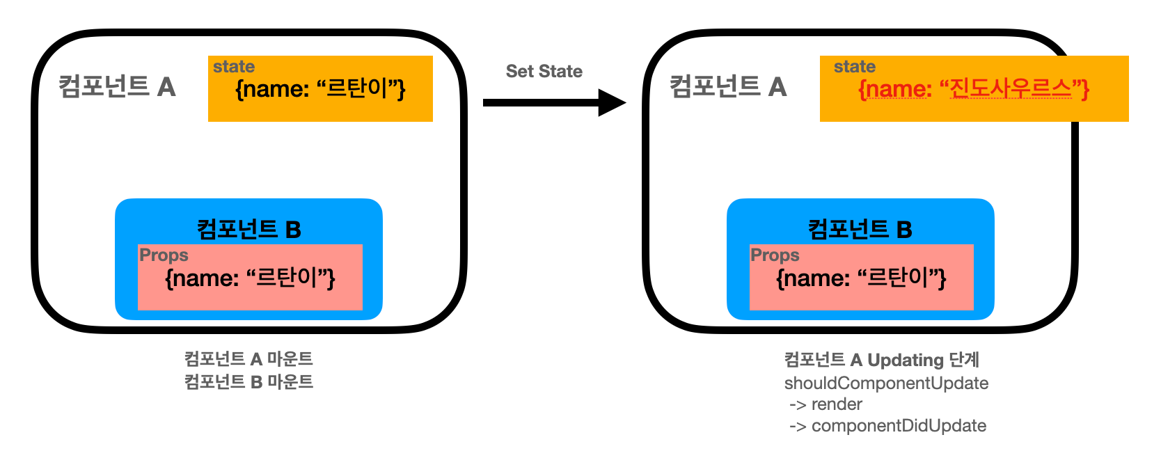 2. 부모 컴포넌트 A와 자식 컴포넌트 B가 있습니다. 컴포넌트 A는 state로 {name: "르탄이"}를 가지고 있고, 자식인 컴포넌트 B에게 name 값을 넘겨주었습니다. 컴포넌트 B는 받아온 name을 화면에 뿌려주고 있습니다. 컴포넌트 A의 state가 {name: "진도사우르스"}로 바뀌었을 때, 어떤 과정을 거쳐 바뀐 값을 화면에 보여주는 지 라이프 사이클 흐름을 그려볼까요?