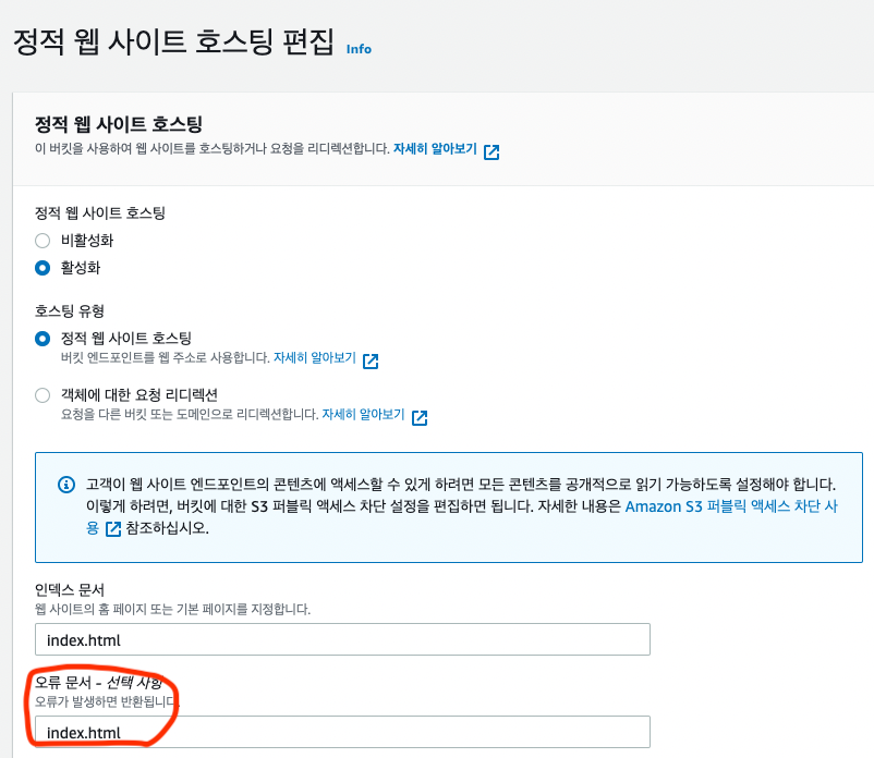 - 에러 해결 방법은? s3가 어떤 상황이건 index.html을 보도록 설정해주는 것